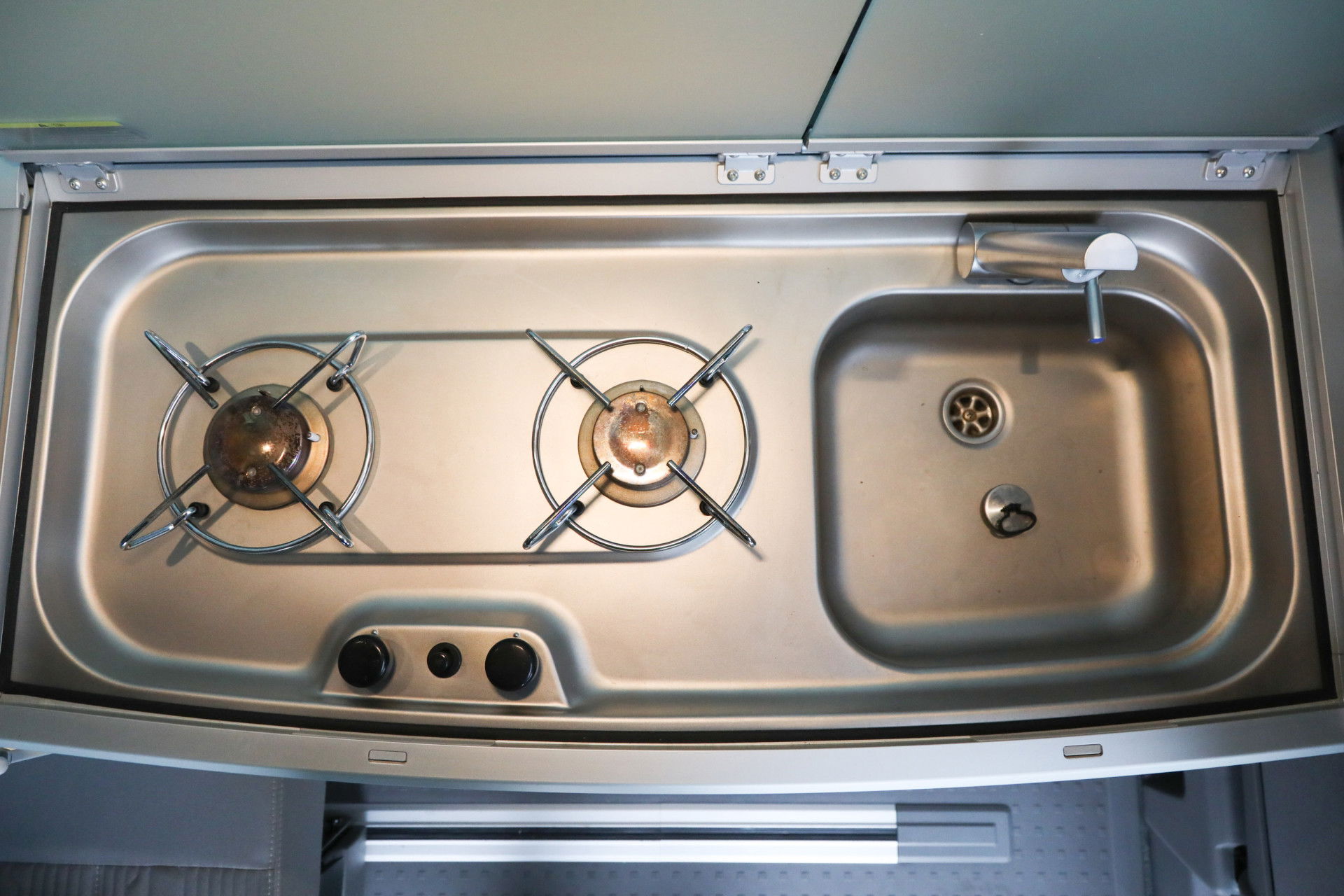 Buitentafel 2 Stoelen in de achterklep Keuken met kooktoestel, wasbak en koelbox