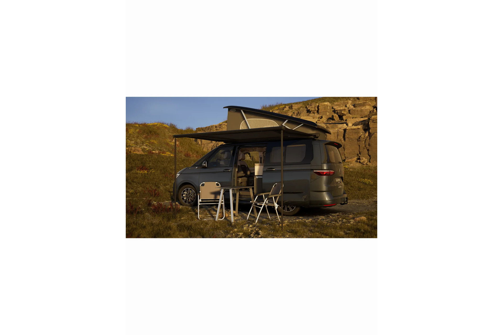 2 Stoelen in de achterklep Buitentafel Extra hor in tentdoek Fabrieksgarantie Keuken met kooktoestel, wasbak en koelbox