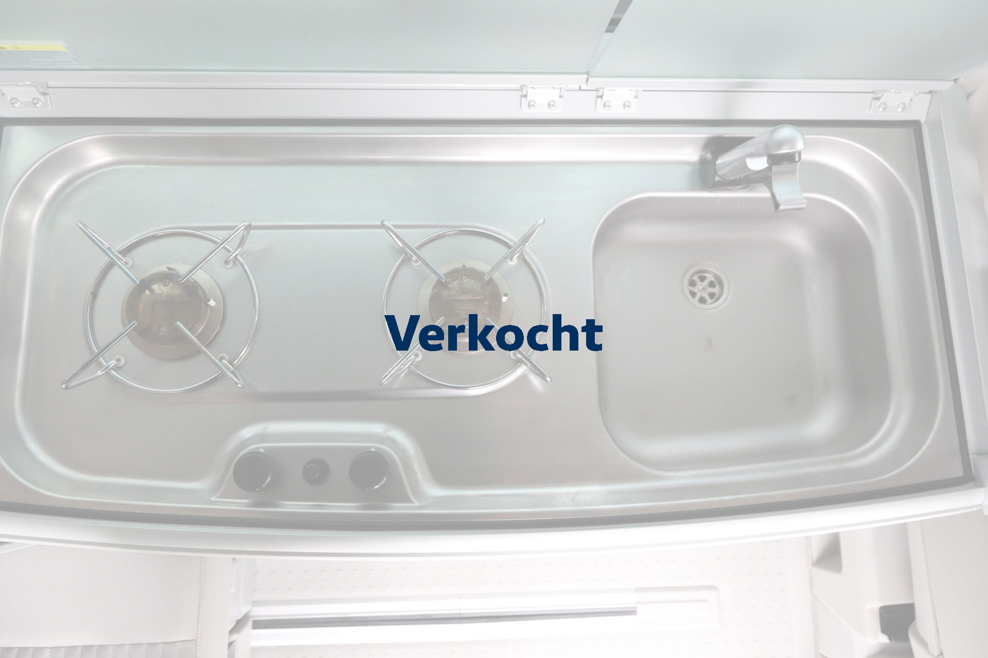 2 Stoelen in de achterklep Keuken met kooktoestel, wasbak en koelbox Buitentafel