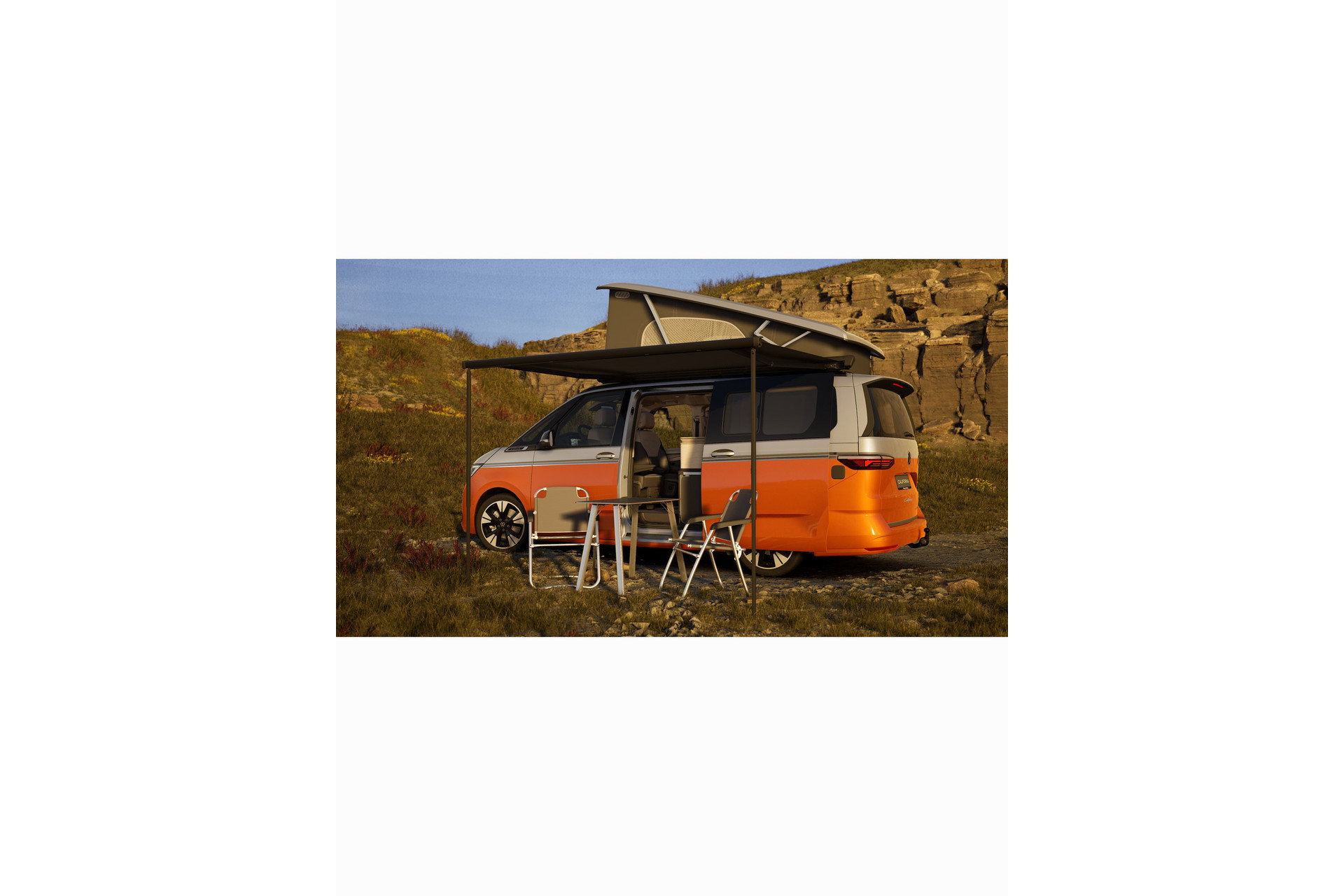 Extra hor in tentdoek Keuken met kooktoestel, wasbak en koelbox Fabrieksgarantie Buitentafel 2 Stoelen in de achterklep