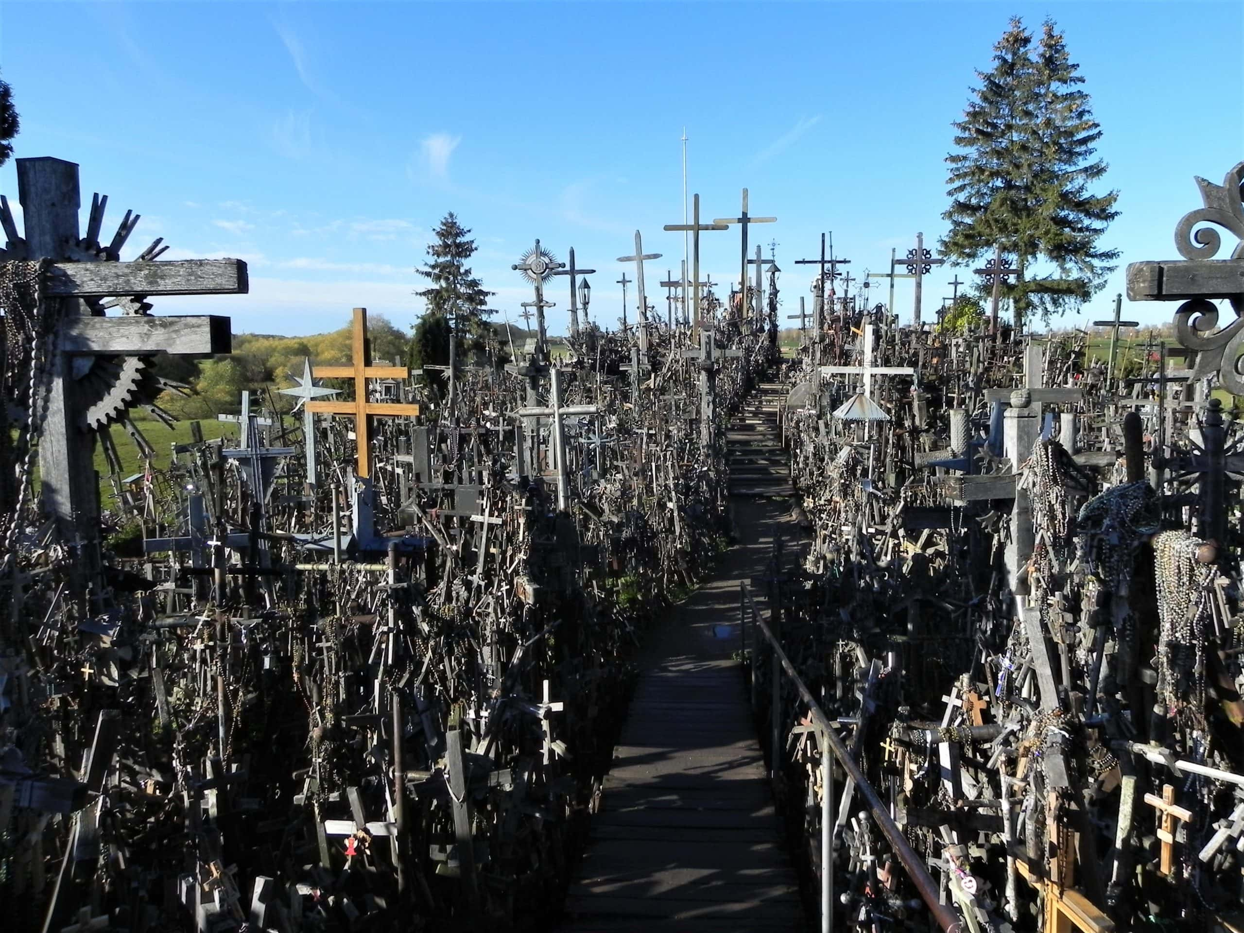 “Via Duitsland en Polen reden we eerst naar Litouwen, de grootste en voor mijn gevoel het minst welvarende land van de Baltische Staten. Je ziet er veel land- en bosbouw. De hoofdstad Vilnius is een mooie stad, met veel historie. Je ziet er veel wat pompeuze gebouwen. Zowel in de architectuur als in de mentaliteit ervaar je veel verschillende invloeden en nationaliteiten (Pools, Russisch, joods – katholiek – Russisch Orthodox). In 2009 was Vilnius trouwens de culturele hoofdstad van Europa. We overnachtten op de Downtown Forest hostel camping, een kleine camping aan de rand van de oude stad, op wandelafstand van het centrum. https://downtownforest.lt/. Het eten is er niet erg verfijnd maar desondanks smaakvol en voedzaam. Veel koolproducten, zoals wortel, aardappel en zuurkool. Veel vlees ook, met varkenspoten en bloedworst. Zo’n 12 kilometer ten noorden van de stad Šiauliai vind je Kryziq Kalnas, ofwel de Heuvel der Kruisen (of Kruisheuvel). Het is een nationaal bedevaartsoord dat symbool staat voor hun onafhankelijkheid. We reisden verder, richting Letland.”
